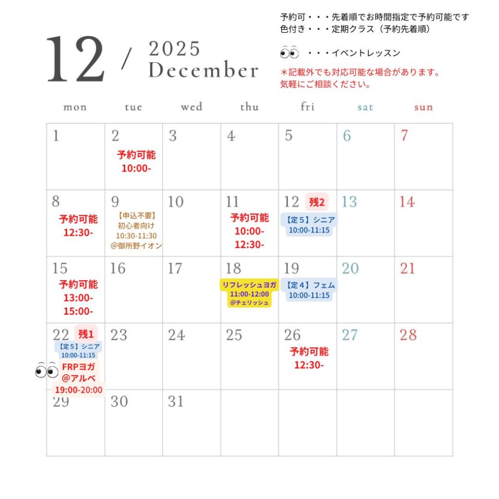 12月のスケジュールを公開します。ご新規のお客様につきましては一度お問い合わせフォームまたはLINE公式アカウントよりご連絡いただけますと幸いです。カレンダー上NGになっていても調整可能な場合もありますのでお気軽にお問い合わせください。