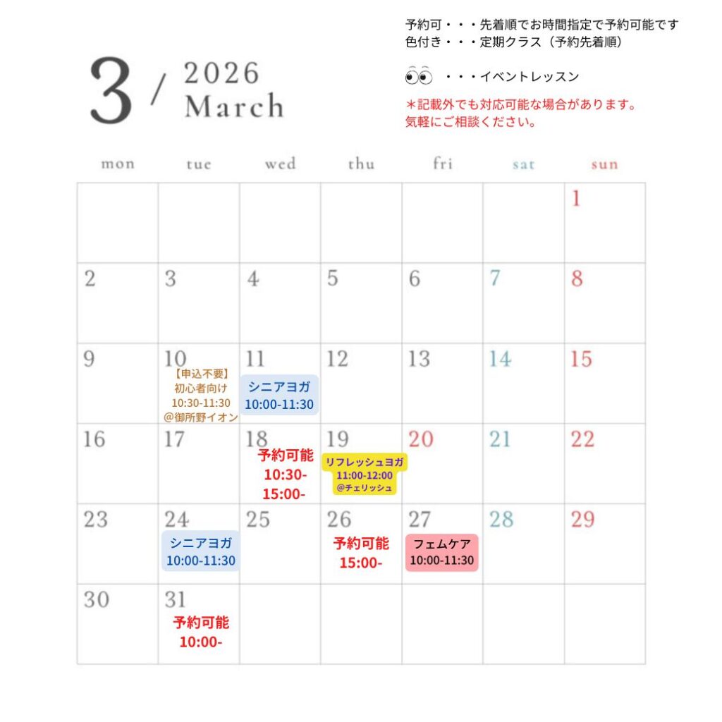 3月のスケジュールを公開します。ご新規のお客様につきましては一度お問い合わせフォームまたはLINE公式アカウントよりご連絡いただけますと幸いです。カレンダー上NGになっていても調整可能な場合もありますのでお気軽にお問い合わせください。